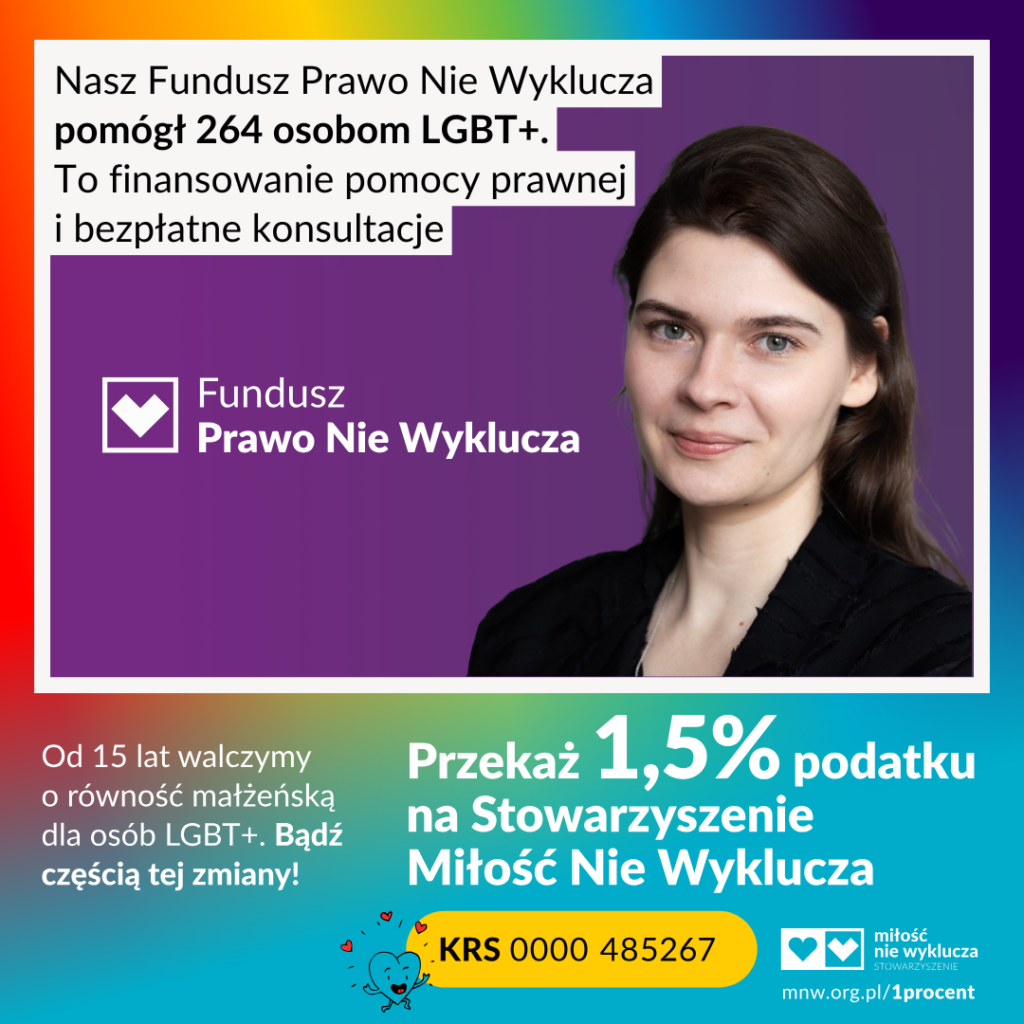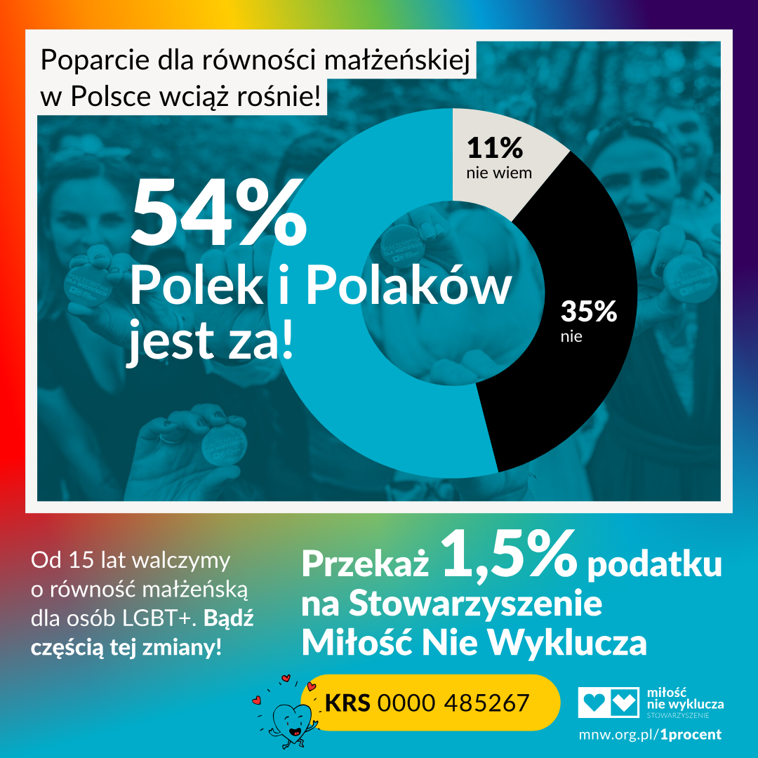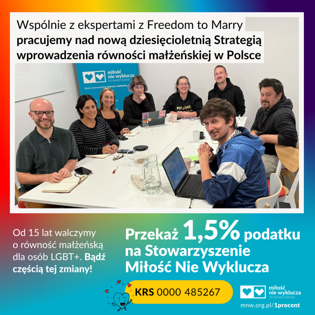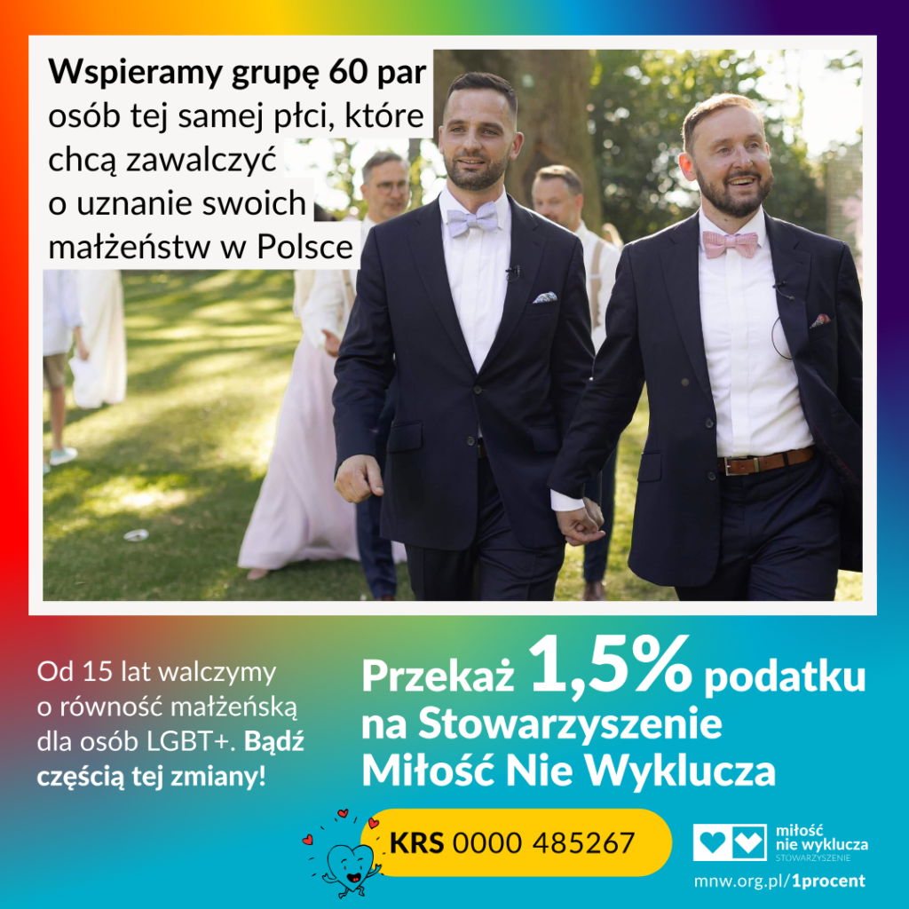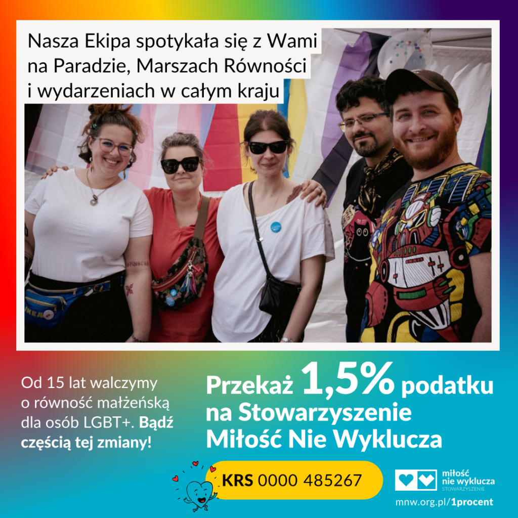Stowarzyszenie Miłość Nie Wyklucza to organizacja pożytku publicznego, która od 15 lat pracuje po to, aby osoby LGBT+ i ich rodziny mogły wreszcie bezpiecznie żyć w Polsce. Przekaż 1,5% podatku na Miłość! Razem wprowadzimy równość małżeńską!