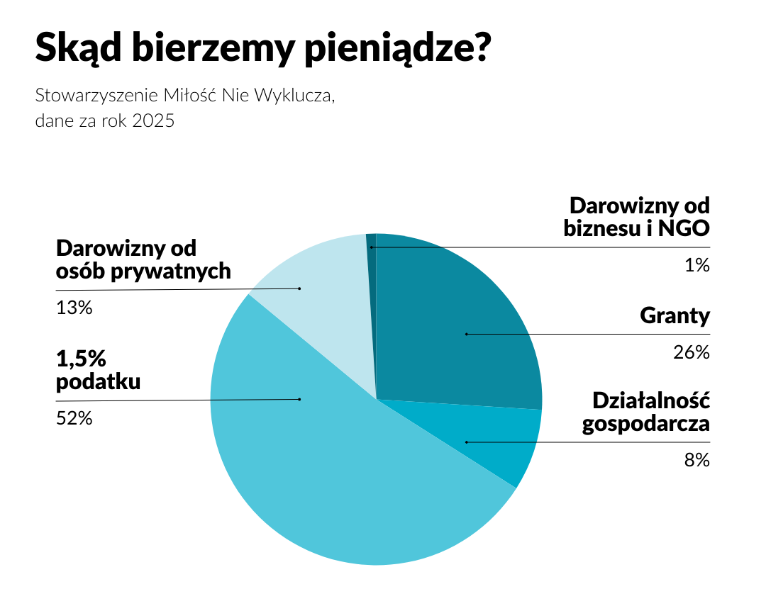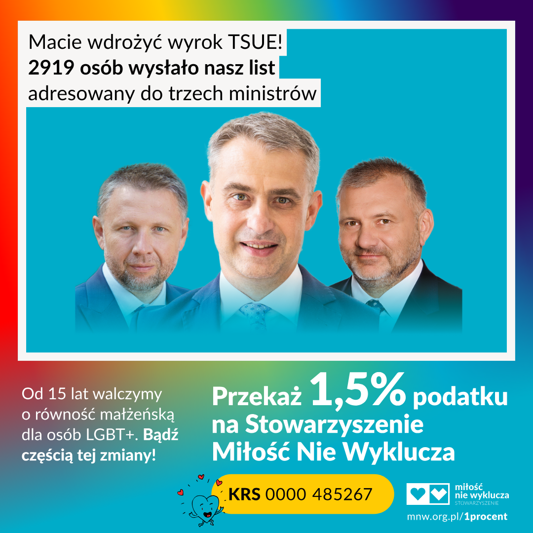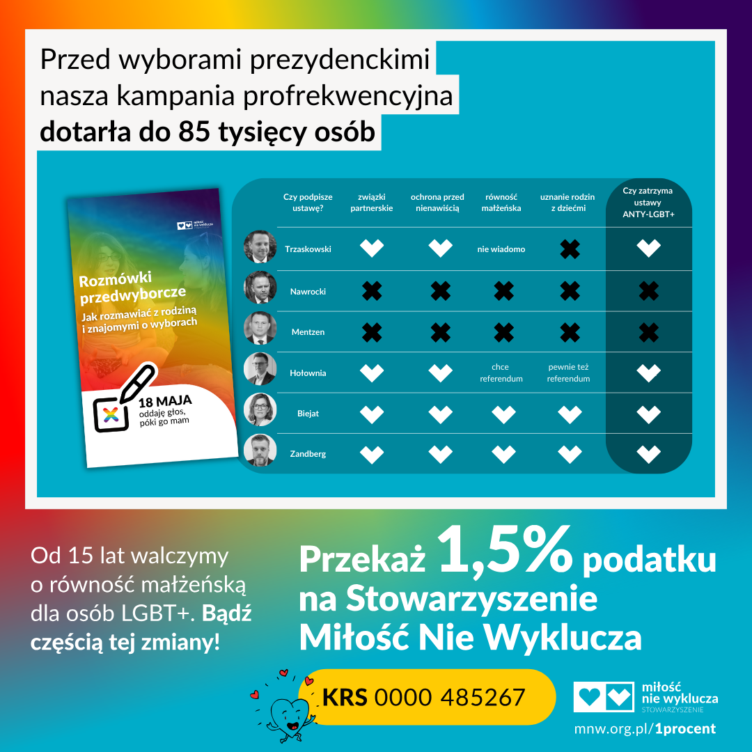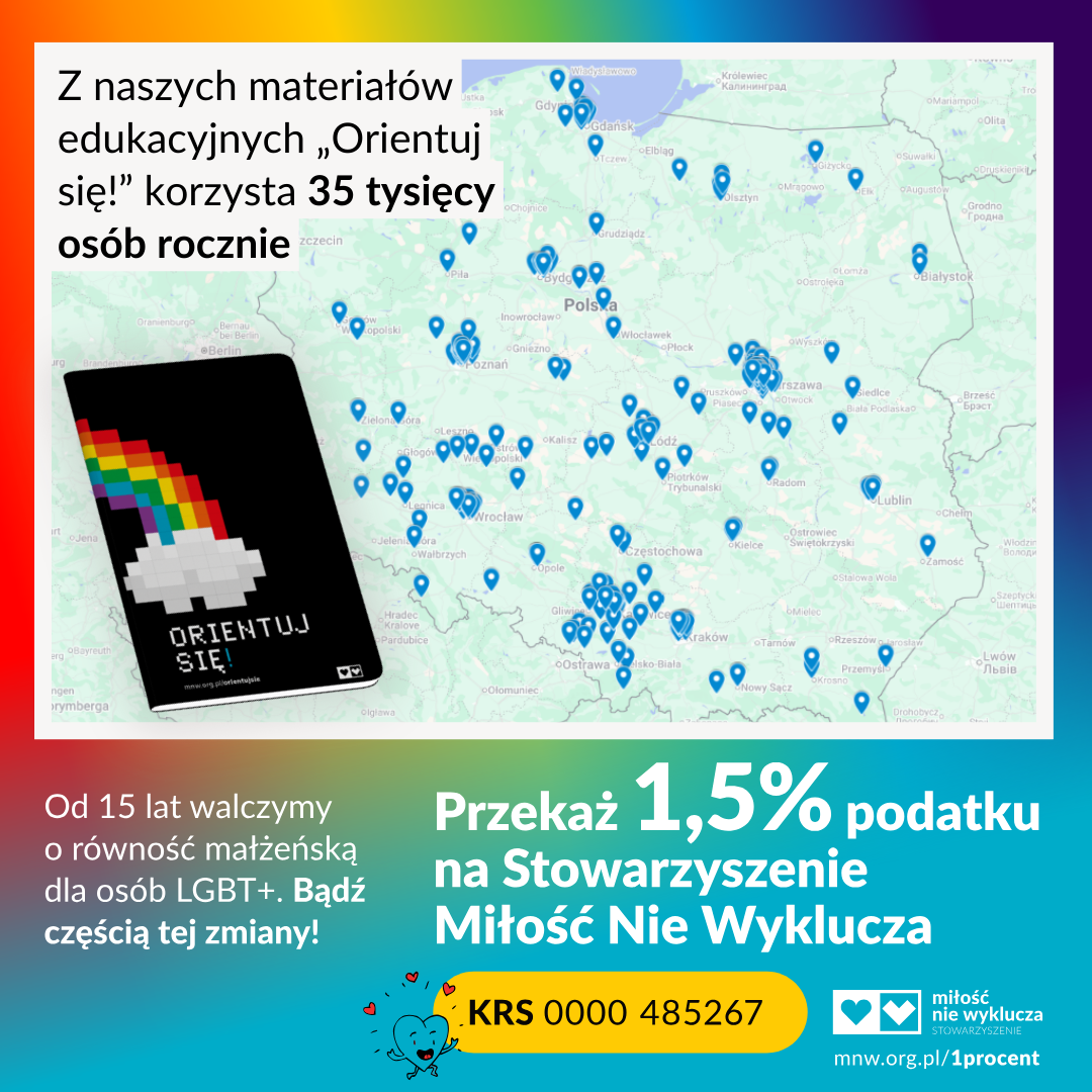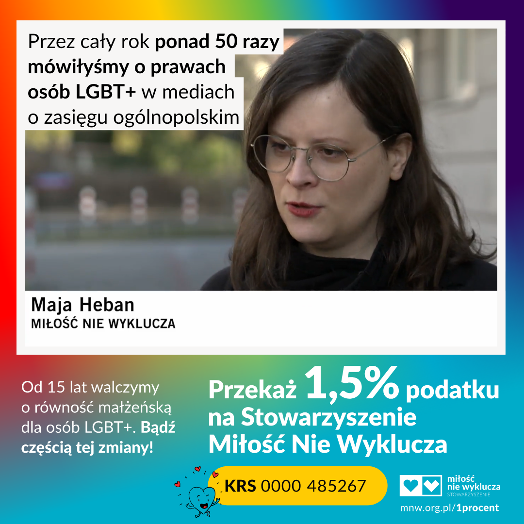 Stowarzyszenie Miłość Nie Wyklucza to organizacja pożytku publicznego, która od 15 lat pracuje po to, aby osoby LGBT+ i ich rodziny mogły wreszcie bezpiecznie żyć w Polsce. Przekaż 1,5% podatku na Miłość! Razem wprowadzimy równość małżeńską!