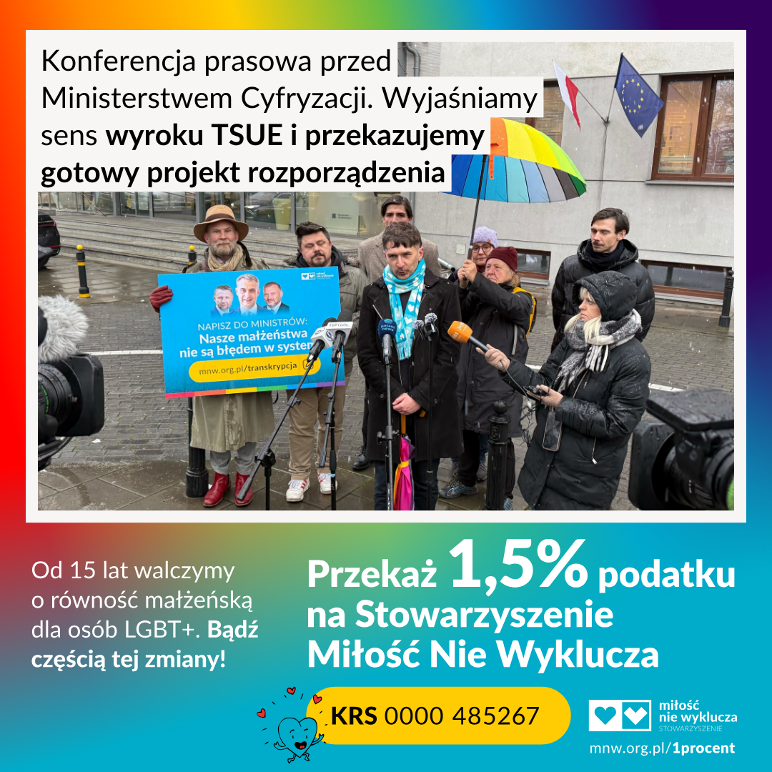 W dniu historycznego orzeczenia Trybunału Sprawiedliwości Unii Europejskiej, który nakazał Polsce wydawanie transkrypcji zagraniczncyh małżeństw parom osób tej samej płci, zorganizowaliśmy konferencję prasową przed Ministerstwem Cyfryzacji.