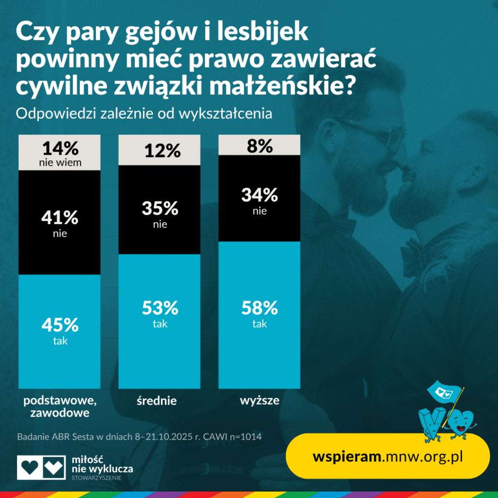 Badanie zrealizowane przez firmę ABR Sesta w dniach 8-21.10.2025 r. metodą CAWI na grupie 1014 osób (próba ogólnopolska z kwotami na wiek, płeć, klasę wielkości miejscowości i województwo) i jest częścią szerokiego projektu badawczego realizowanego przez organizacje społeczne działające na rzecz osób LGBT+ w Polsce: Fundację TTT – Tęczowy Think Tank oraz stowarzyszenia Fabryka Równości, Grupa Stonewall, Kampania Przeciw Homofobii i Miłość Nie Wyklucza, przy współfinansowaniu Ambasady Królestwa Niderlandów, Ambasady Królestwa Norwegii i Przedstawicielstwa Dyplomatycznego Flandrii w Polsce. Pełny raport z badań zostanie opublikowany w nadchodzących miesiącach.